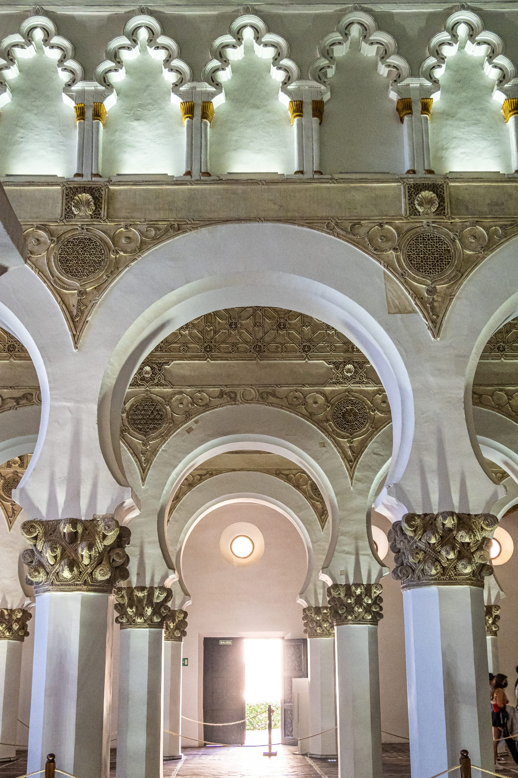 Santa María La Blanca, another of the essential monuments to see in Toledo, is surprising for its simplicity and beauty. Its five-nave structure, with the highest central nave, is formed by horseshoe arches supported by octagonal columns decorated with tiled plinths. The carved wooden ceiling, a classic Mudejar coffered ceiling, adds a warm and elegant touch.